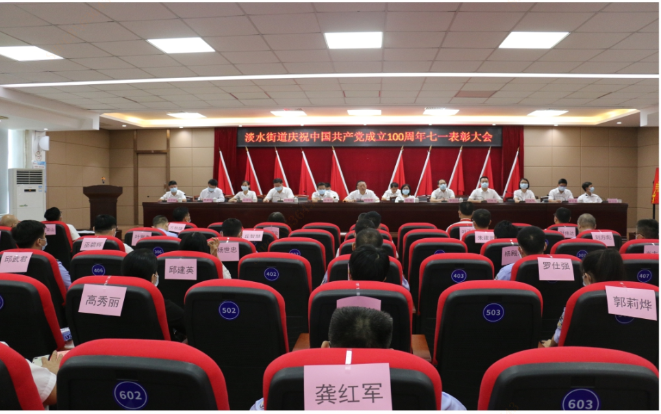为庆祝建党 100 周年,表彰先进典型,6 月 30 日,淡水街道在五楼大会议室举办庆祝建党 100 周年暨“七一”表彰大会,激励各级党组织和广大党员不忘初心,牢记使命,奋发有为,勇当先锋。街道班子成员、各办(公司)负责人、各村社区党组织书记、各派出所所长、各市场监督管理所所长以及受表彰的先进个人和党组织等约 170 人参加会议。