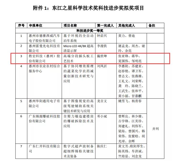 12月17日, 2021年东江之星科学技术奖经过形式审查、技术评审、综合评审等环节,评出拟奖项目共25项,其中科技进步奖一等奖拟奖项目7项,科技进步奖二等奖拟奖项目10项,自主创新促进奖8项。我司的“高端分段插头板工艺技术”项目拟获评科技进步一等奖。