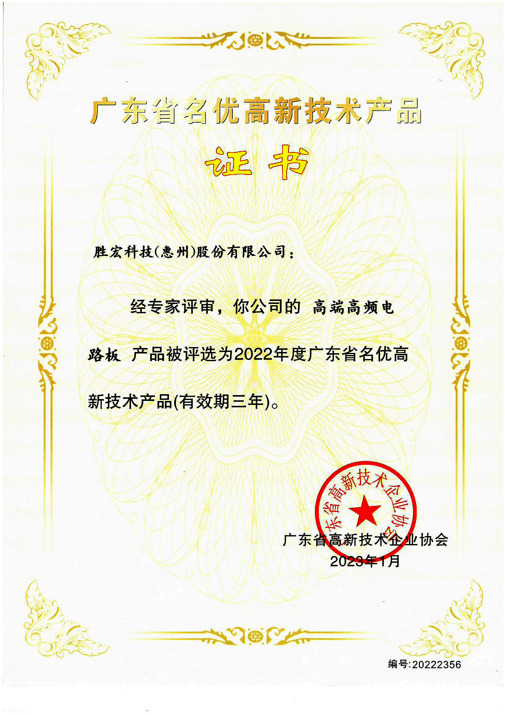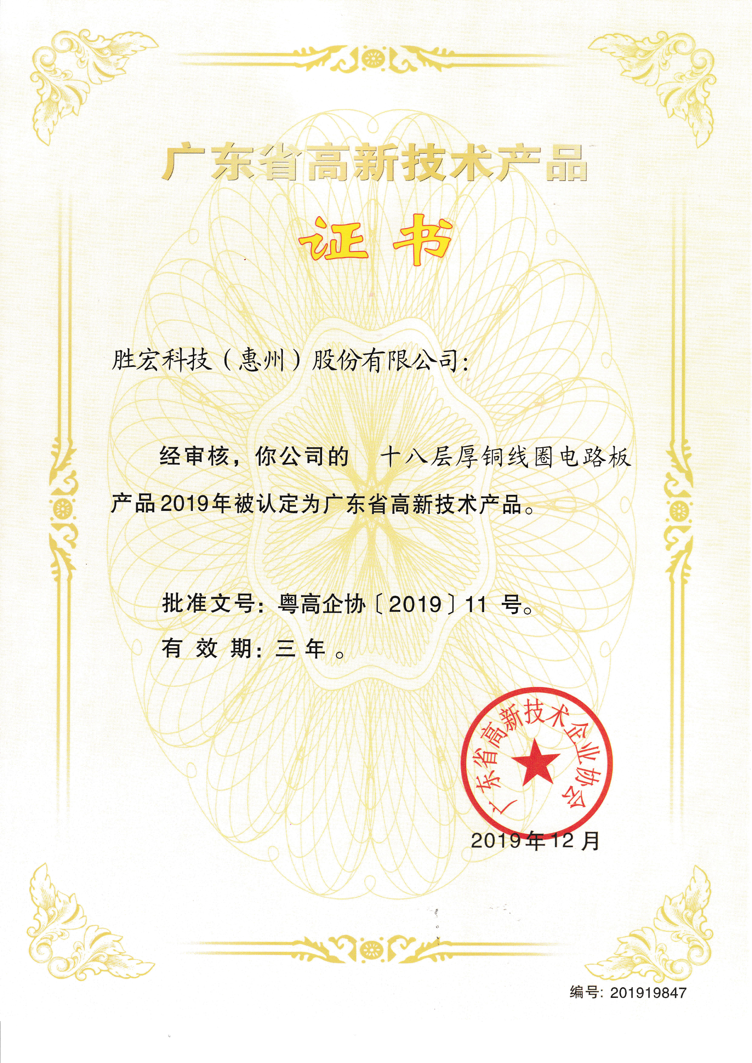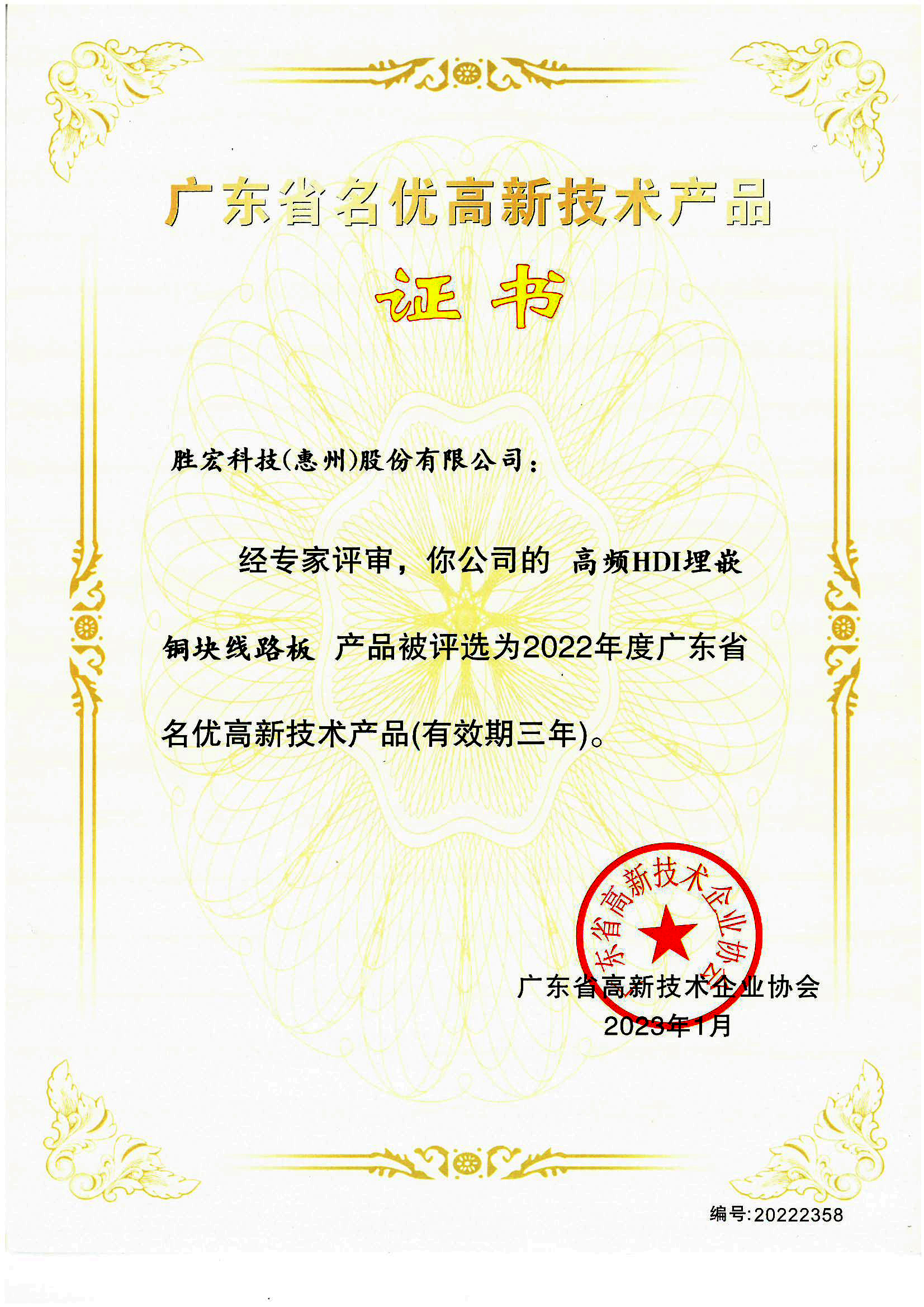 “高频HDI埋嵌铜块电路板”名优高新技术产品证书